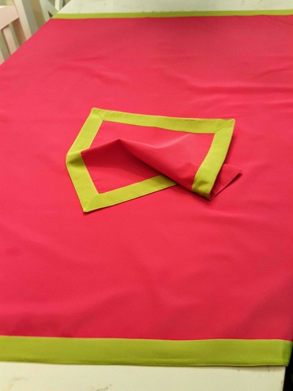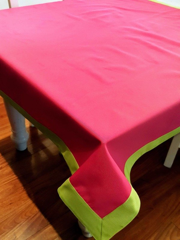 1 Mantel cuadrado 1.32x1.32m en tela gros fucsia con zócalo verde manzana de 4.50cm