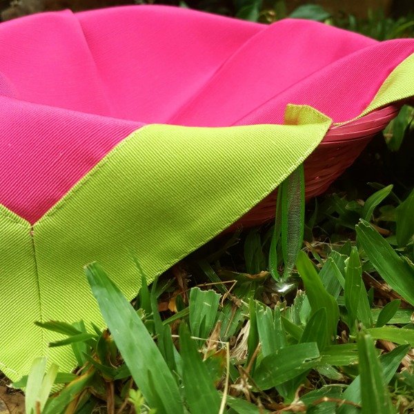 1 Mantel cuadrado 1.32x1.32m en tela gros fucsia con zócalo verde manzana de 4.50cm
